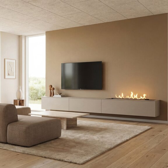 Denver F2 bioethanol burner in the living room black sideboard in front of the wall with forest picture