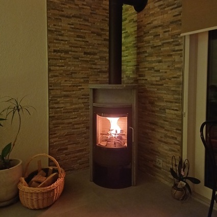BANDO is available with soapstone or natural stone Porto cladding. Both natural materials store a lot of heat and harmonise perfectly with the painted steel body. The strongly curved ceramic glass panel emphasises the beautiful, straight side lines and allows a clear view of the large fire.